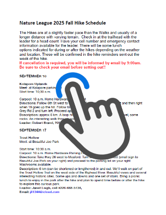 The Hikes are at a slightly faster pace than the Walks and usually of a longer distance with varying terrain. Check in at the trailhead with the leader for a head count. Have your cell number and emergency contact information available for the leader. There will be some lunch options indicated for during or after the hikes depending on the weather and location. These will be confirmed in the hike reminders sent out the